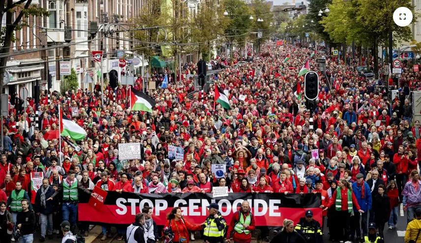 Hollanda’da Gazze’ye yönelik saldırılara karşı düzenlenen üçüncü büyük protestoda bu kez Amsterdam sokakları kırmızıya büründü.Museumplein Meydanı’nda toplanan yaklaşık 250 bin kişi, Hollanda hükümetine “artık somut adım at” çağrısında bulundu. Göstericiler, baştan sona kırmızı kıyafetler giyerek hem Gazze’deki kan dökülmesine hem de hükümetin sessizliğine tepki gösterdi. Yoğun kalabalık nedeniyle yürüyüş planlanandan önce başladı. Eyleme Amnesty International, […]