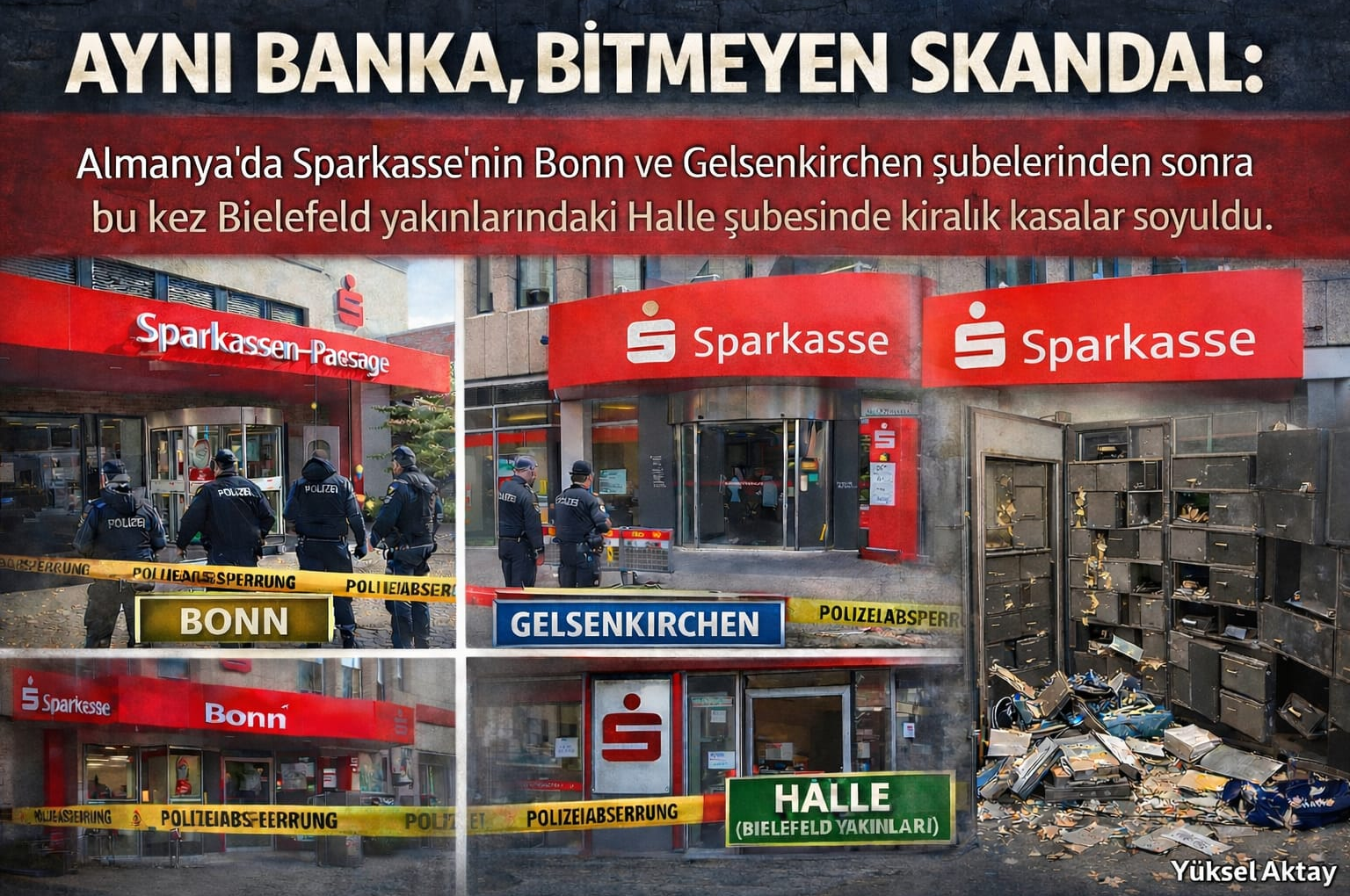 ALMANYA’DA YİNE AYNI BANKA, YİNE SOYGUN! Almanya’da Sparkasse bankalarına yönelik kiralık kasa soygunlarına bir yenisi daha eklendi.Gelsenkirchen ve Bonn’daki olayların ardından bu kez Kuzey Ren-Vestfalya eyaletinin Halle kentindeki bir Sparkasse şubesinde soygun meydana geldi. Alman polisinin yaptığı açıklamaya göre, olay salı günü öğle saatlerinde bankanın mesai saatleri içinde gerçekleşti. Kimliği henüz belirlenemeyen faillerin, kiralık kasaların […]