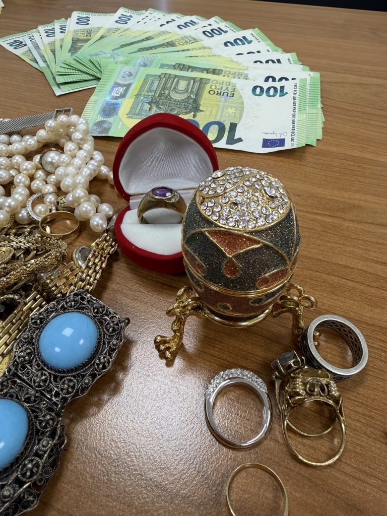 Ele geçirilen ve değeri 106.000 avro olarak tespit edilen 1,7 kg ağırlığında altın takı, 11 saat, inciler, 144 çeşitli madeni para ve biri Fabergé yumurtası şeklinde olan iki dekoratif kutudan oluştuğu paylaşıldı.Ele geçirilen değerli eşyalara el konulurken sürücü hakkında işlem başlatıldı.