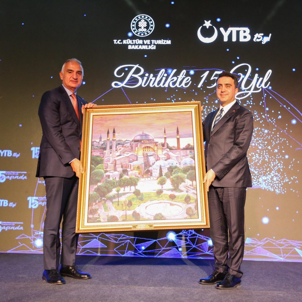 YTB Başkanı Abdulhadi Turus, günün anısına Kültür ve Turizm Bakanı Mehmet Nuri Ersoy’a hediye takdiminde bulundu. Ersoy’a İstanbul Üniversitesi Sanat Tarihi Bölümünde doktora yapmış ve halihazırda ülkesine dönmüş olan Filistinli ressam öğrencimiz Halid ISTAITIA tarafından yağlı boya olarak yapılan Ayasofya portresi takdim edildi.